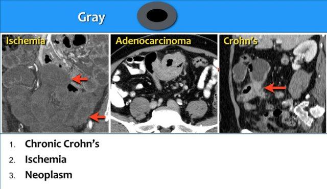 Trong kiểu hình tỷ trọng xám, thành ruột dày và mặc dù đã tiêm đủ liều thuốc cản quang, tổn thương vẫn ngấm thuốc kém và không thể phân biệt được các lớp khác nhau của thành ruột.
