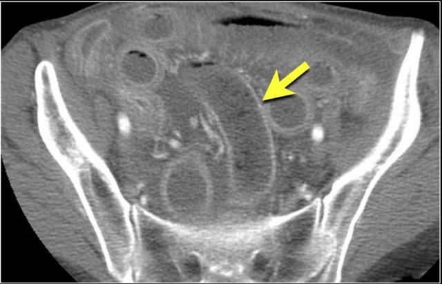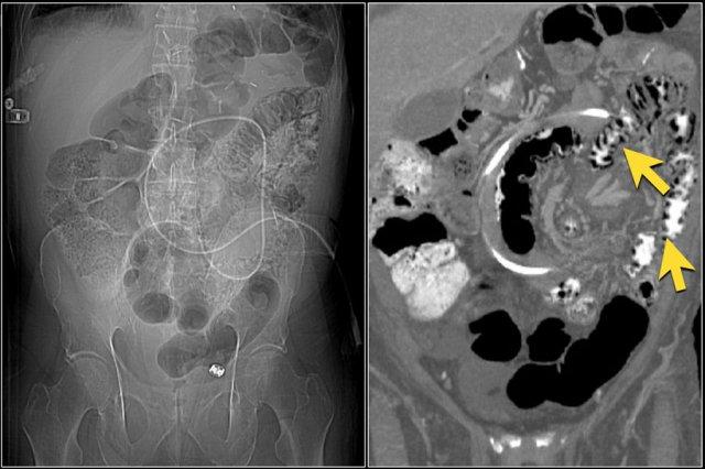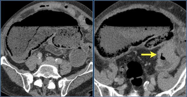 Mũi tên màu vàng chỉ dấu hiệu phân trong ruột non ở bệnh nhân tắc ruột non.