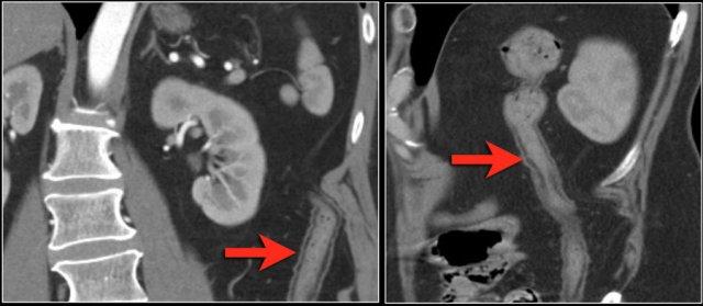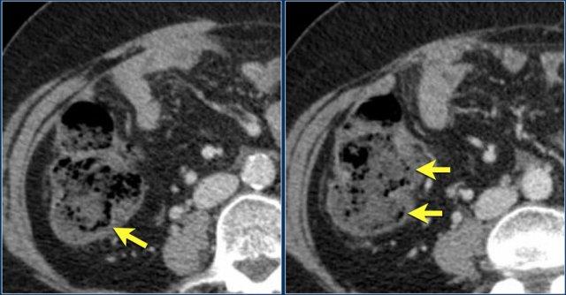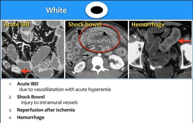 Điều này có thể dẫn đến hình ảnh ngấm thuốc mạnh bất thường của thành ruột, như trong trường hợp bệnh nhân đang trong tình trạng sốc mất máu này.