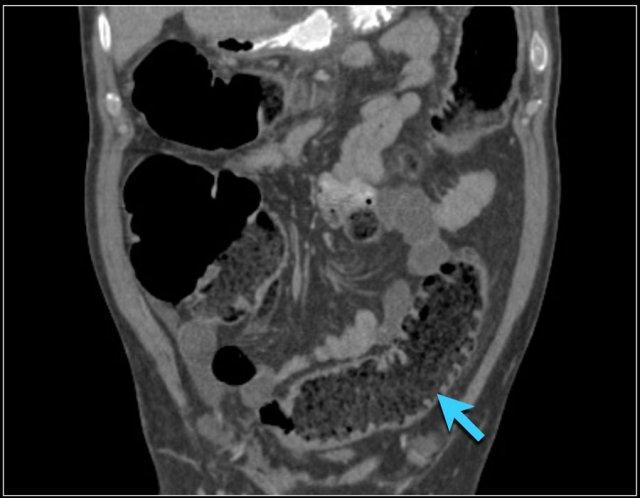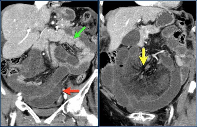 Một bệnh nhân khác với hình ảnh ruột thiếu máu cục bộ và phù nề mạc treo ruột lan rộng.