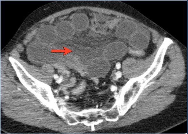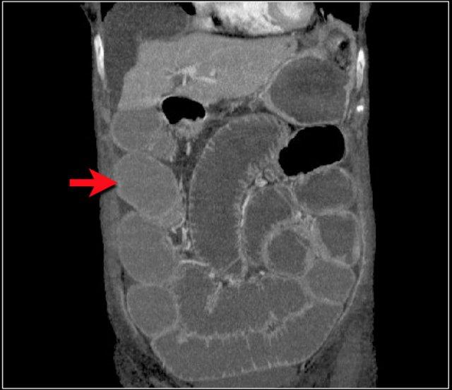Lưu ý hình ảnh ngấm thuốc mạnh của một đoạn ruột non dài với thành ruột dày.