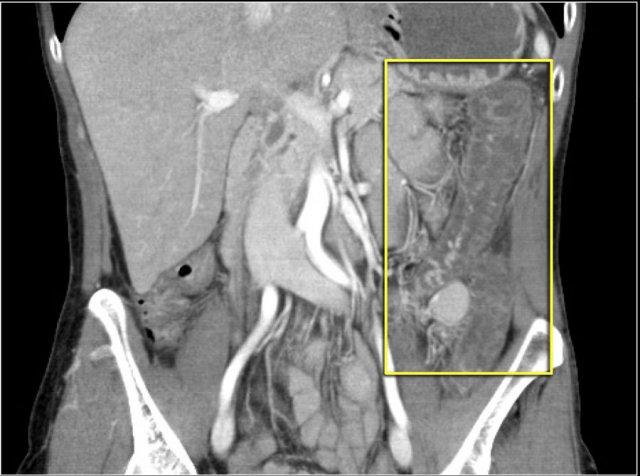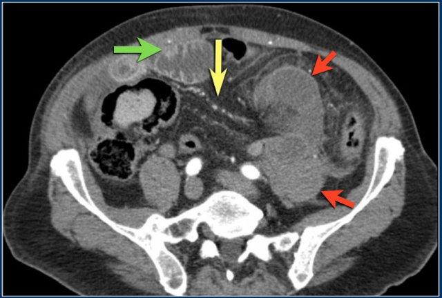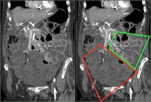 Điều này được minh họa rõ ràng ở bệnh nhân này, trong đó hỗng tràng ngấm thuốc tốt (vùng xanh lá), trong khi hồi tràng giảm ngấm thuốc (vùng đỏ) do thiếu máu cục bộ.
