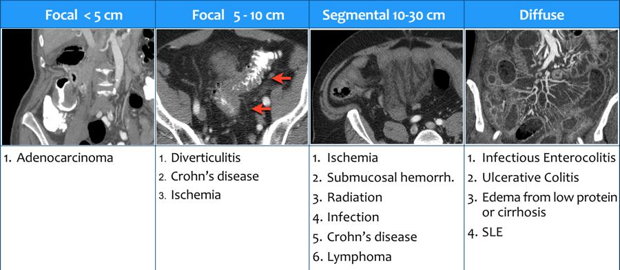 Chúng tôi sẽ thảo luận về cách tiếp cận theo hình thái đối với bệnh nhân có dày thành ruột, với sự chú trọng đặc biệt vào các hình thái ngấm thuốc trên CT.