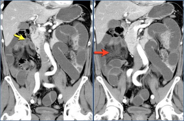 Lưu ý nhóm các quai ruột non có thành dày ở vùng bụng trên phải (mũi tên vàng).