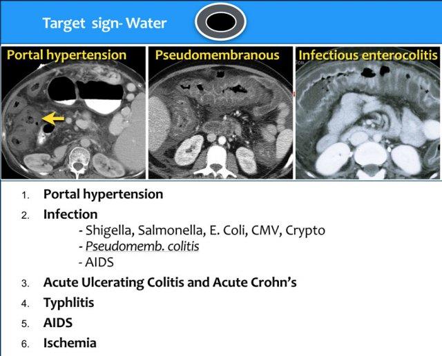 Khi có ngấm thuốc mạnh ở thành ruột dày, đôi khi khó phân biệt giữa kiểu hình tăng tỷ trọng (dạng trắng) và kiểu hình dấu hiệu bia nước (water-target-sign).