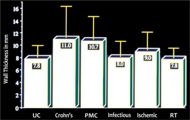 - Dày thành ruột toàn chu vi và lan tỏa kèm phù nề lớp dưới niêm mạc.