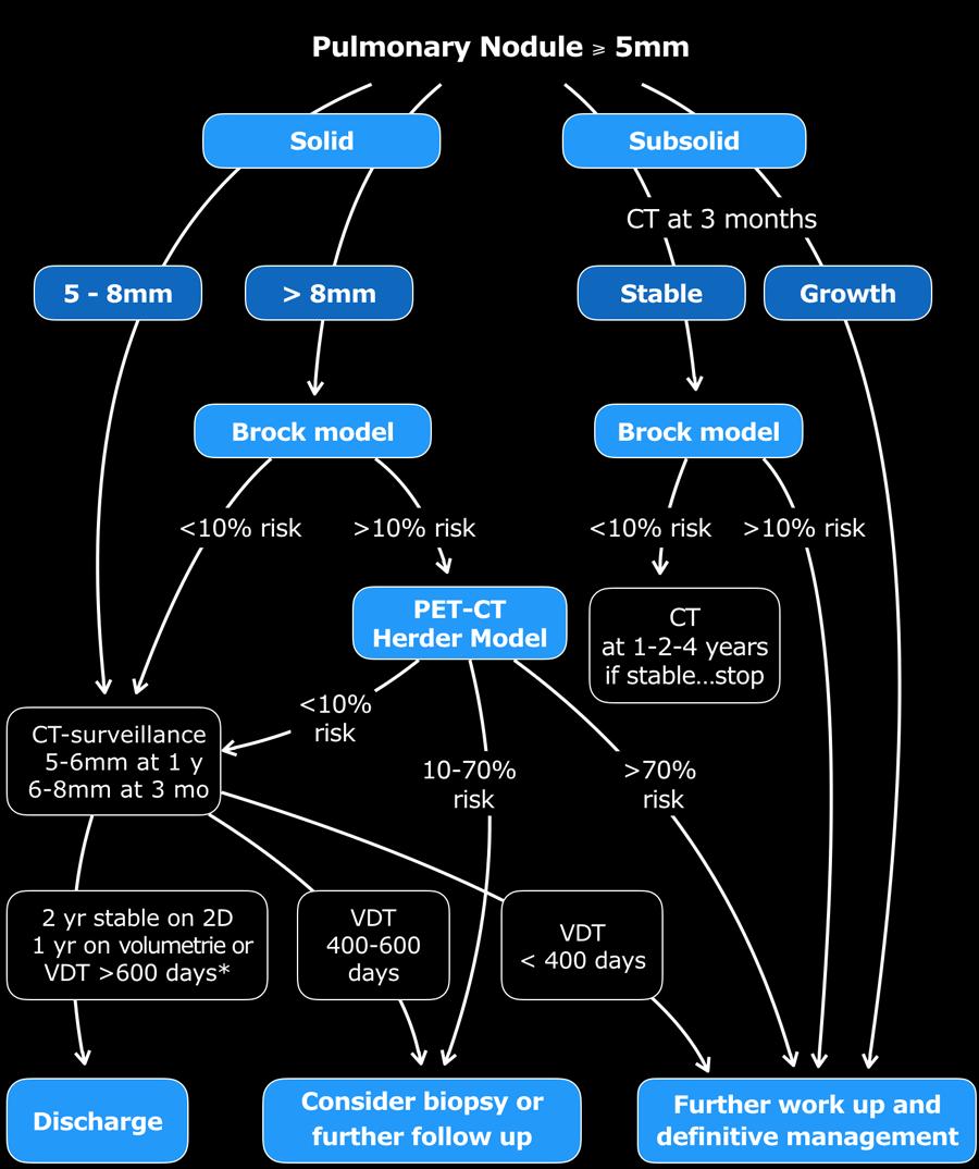 Trong trường hợp có nhiều nốt phổi, chiến lược đánh giá nguy cơ và theo dõi được dựa trên nốt lớn nhất.