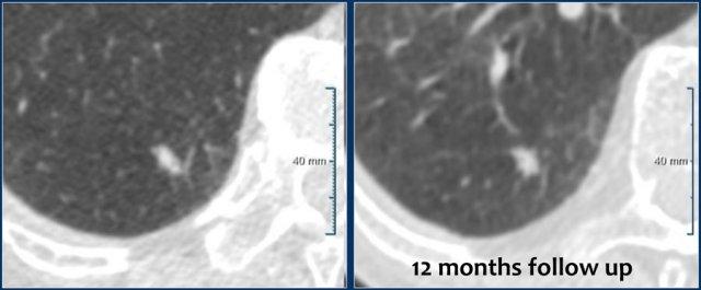 Hình ảnh cho thấy một nốt đặc đơn độc không có bờ tua gai kích thước 7 mm (162 mm3) ở thùy dưới phổi phải (RLL) của bệnh nhân nam 55 tuổi, không có tiền sử gia đình dương tính, nhưng có khí phế thũng nhẹ.