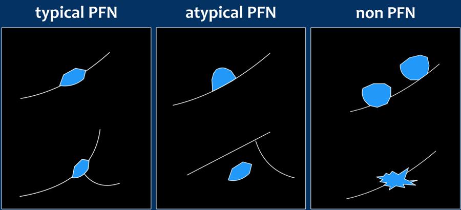 Một PFN điển hình có đặc điểm bám vào rãnh liên thùy phổi, đồng nhất, đặc và có bờ nhẵn.