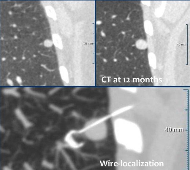 Hình ảnh cho thấy một nốt đặc đơn độc không có bờ tua gai kích thước 9 mm (362 mm3) ở thùy dưới phổi trái (LLL) của bệnh nhân nữ 75 tuổi, không có tiền sử gia đình dương tính hoặc khí phế thũng.