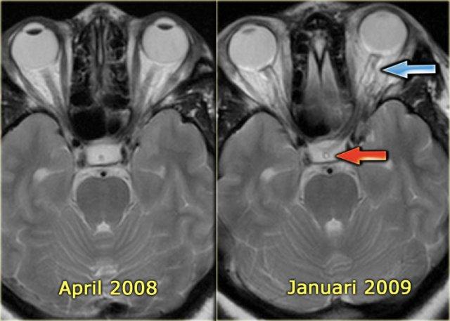 Tháng 1 năm 2009 xuất hiện các dấu hiệu của tăng áp lực nội sọ như dịch não tủy bao quanh dây thần kinh thị giác và dịch não tủy trong cuống tuyến yên.