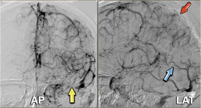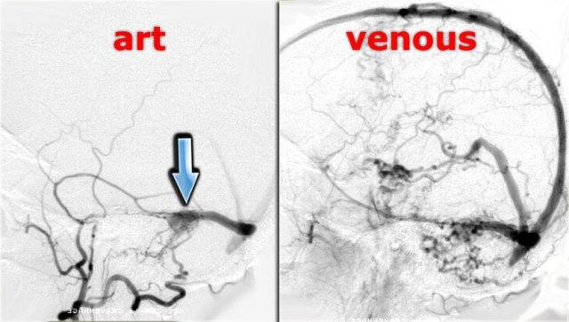 Hình ảnh chụp mạch số hóa xóa nền (DSA) bên trái của một bệnh nhân có DAVF.