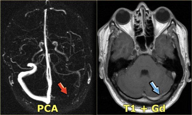 Trong chẩn đoán phân biệt, cũng cần xem xét nhồi máu tĩnh mạch trong vùng phân bố của tĩnh mạch Labbe.