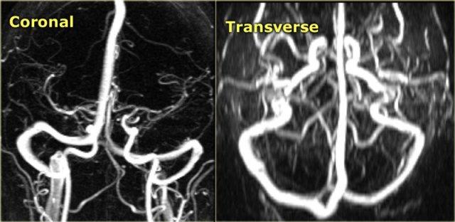 Bên trái là hình ảnh MIP theo mặt phẳng đứng dọc và chếch của một ca chụp tĩnh mạch MR có tiêm thuốc tương phản từ bình thường.