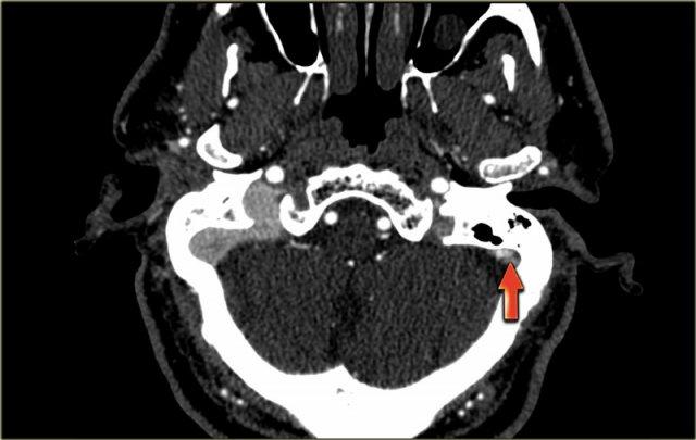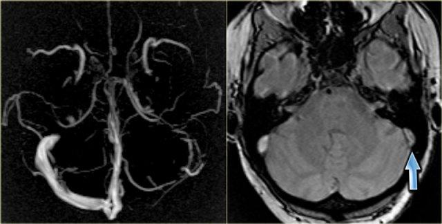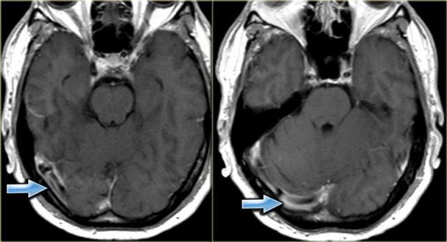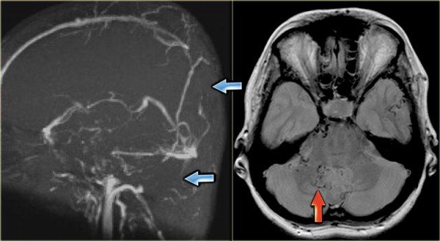 Hình ảnh bên trái là một trường hợp huyết khối xoang ngang phải và xoang ngang-xoang sigma trái (mũi tên).