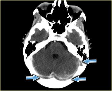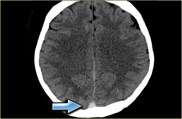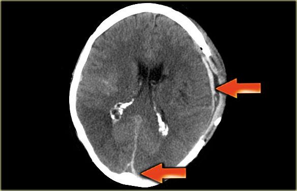 Đây là hình ảnh một bệnh nhân có khối máu tụ dưới màng cứng bên trái, lan rộng đến vùng xoang dọc trên (các mũi tên).