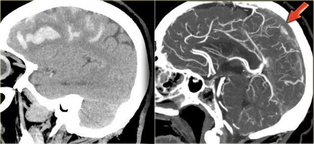 Bên trái là hình ảnh của một bệnh nhân bị huyết khối tĩnh mạch, trong tình trạng hôn mê và không đáp ứng với liệu pháp chống đông.