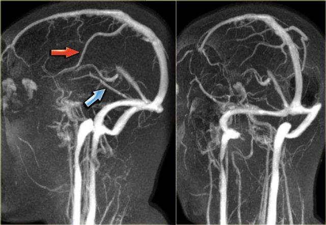 Tuy nhiên, ở một giai đoạn nhất định của huyết khối, có sự hiện diện của deoxyhemoglobin nội bào, chất này giảm tín hiệu trên T2W và bắt chước hình ảnh mất tín hiệu do dòng chảy.