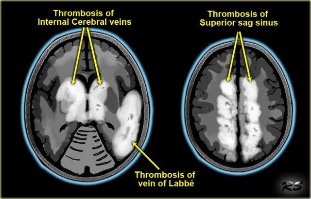 Điều này gặp trong huyết khối xoang tĩnh mạch dọc trên, xoang thẳng và các tĩnh mạch não trong.