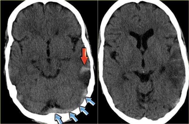 Hình ảnh bên trái là của một bệnh nhân có nhồi máu xuất huyết ở thùy thái dương (mũi tên đỏ).