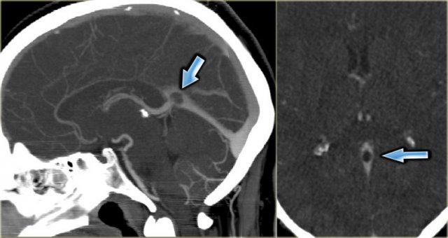 Bình thường, các tĩnh mạch có tỷ trọng cao hơn một chút so với nhu mô não, và trong một số trường hợp rất khó để xác định đây là hình ảnh bình thường hay tăng tỷ trọng thực sự.