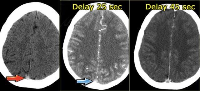 Chỉ đến hình ảnh bên phải, được chụp 45 giây sau khi tiêm thuốc cản quang, mới xuất hiện dấu hiệu delta rỗng, xác nhận sự hiện diện của huyết khối trong xoang.
