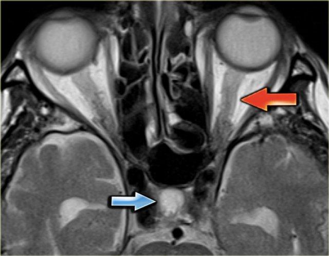 Trên MRI, có thể thấy tăng lượng dịch não tủy quanh dây thần kinh thị giác và hình ảnh hố yên rỗng.