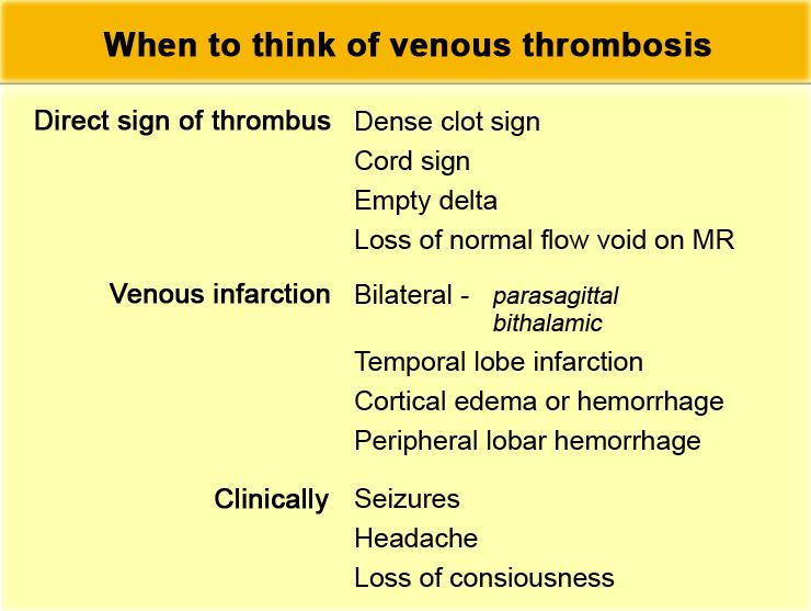 Về mặt lâm sàng, bệnh nhân huyết khối tĩnh mạch thường biểu hiện bằng co giật, đây là triệu chứng không gặp trong nhồi máu động mạch.