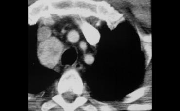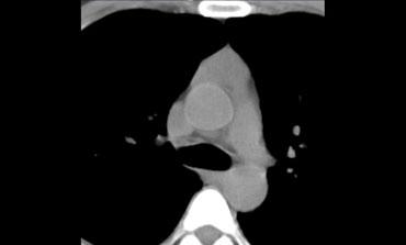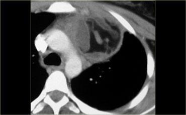 CT cho thấy một khối trung thất trước có tỷ trọng tương đương nước.