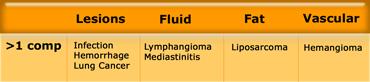 Các tổn thương này có xu hướng chiếm hơn một khoang và bao gồm: viêm trung thất, tụ máu, các bệnh lý mạch máu, ung thư phế quản, di căn và u bạch huyết (chứa dịch).