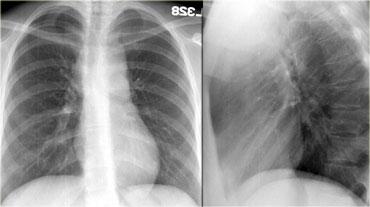 Trên phim X-quang bên trái, có một tổn thương tạo góc nhọn với trung thất.