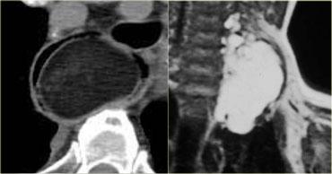 Nếu một khối chứa dịch, có thể là u quái (bên trái) hoặc nang tuyến ức (bên phải).