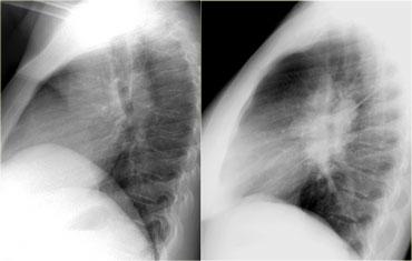 TRÁI: Một khối u phổi tiếp giáp bề mặt trung thất và tạo góc nhọn với phổi. PHẢI: Một khối u trung thất sẽ nằm bên dưới bề mặt trung thất, tạo góc tù với phổi.