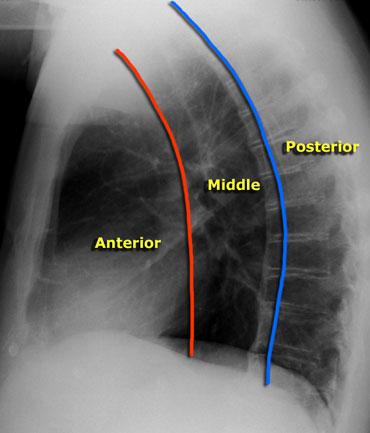 Trên phim chụp X-quang tư thế nghiêng, khoang trước và khoang giữa có thể được phân tách bằng cách vẽ một đường tưởng tượng ở phía trước khí quản và phía sau tĩnh mạch chủ dưới.