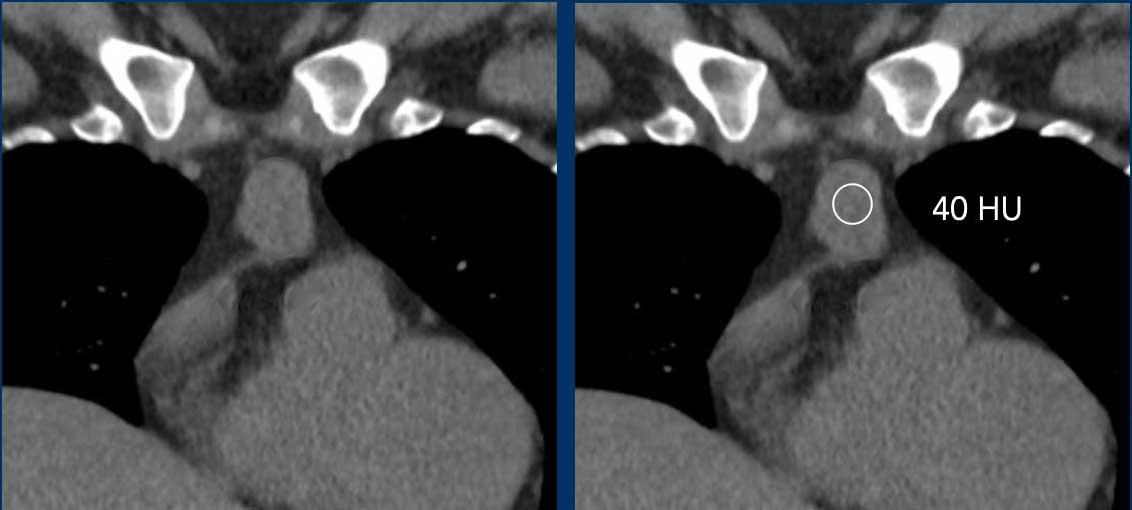 Trong trường hợp như vậy, không thể phân biệt giữa u mỡ tuyến ức (thymolipoma) và u mỡ ác tính (liposarcoma).