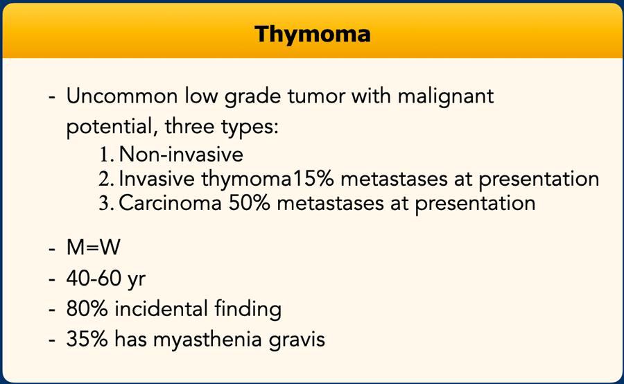 Các u tân sinh phổ biến nhất của trung thất trước mạch bao gồm u tuyến ức (thymoma), ung thư tuyến ức, u thần kinh nội tiết tuyến ức, u quái (teratoma) và u lympho.