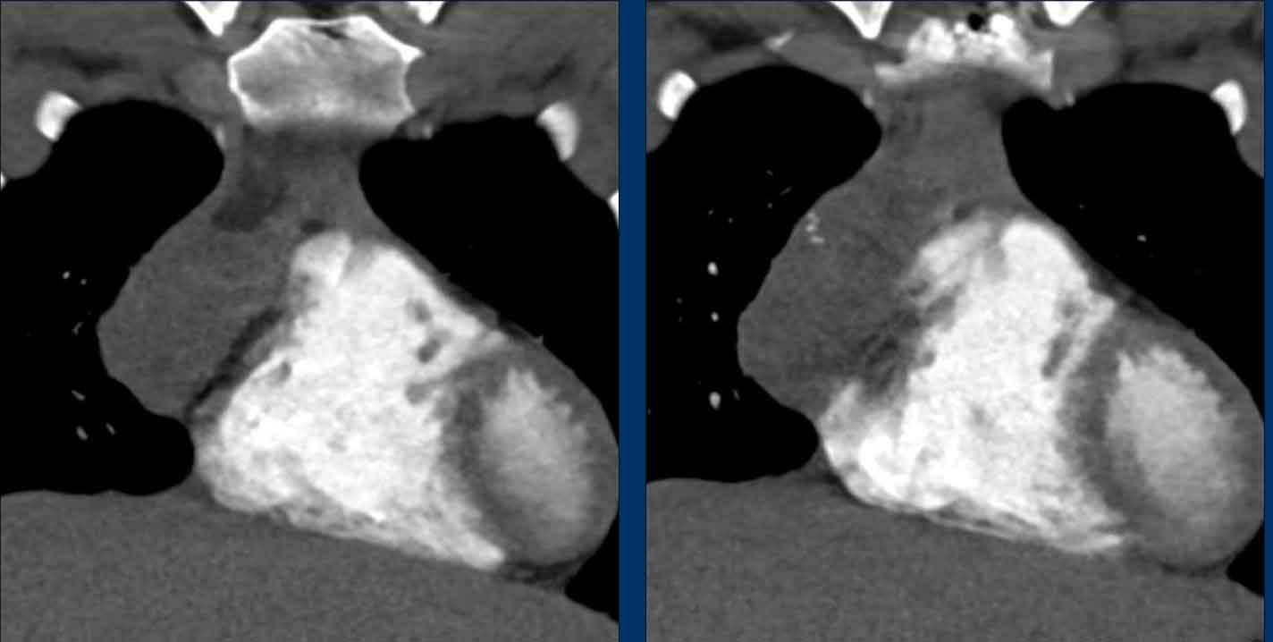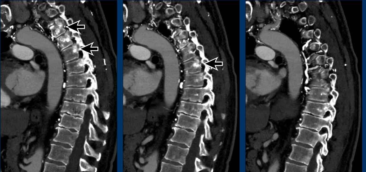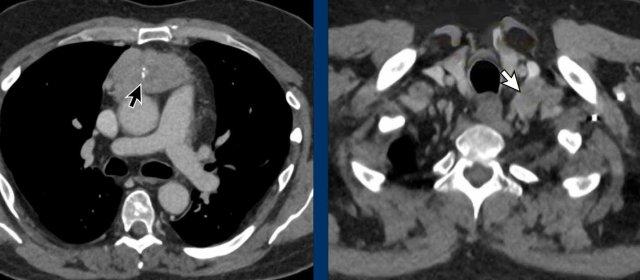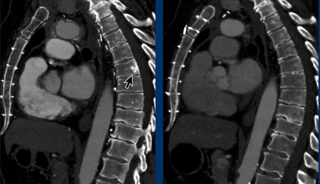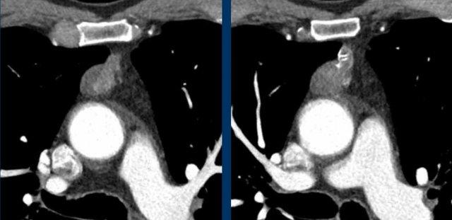Lưu ý sự hiện diện của các tĩnh mạch bàng hệ giãn. Điều này được giải thích bởi thực tế là trong phẫu thuật, tĩnh mạch tay đầu (brachiocephalic vein) bị thắt lại, có thể dẫn đến sự hình thành các tĩnh mạch bàng hệ đáng kể. Các cấu trúc tăng tỷ trọng quan sát thấy trong thân đốt sống không phải là di căn xơ cứng, mà là hậu quả của ứ trệ tĩnh mạch. Những hình ảnh này biểu hiện sự ngấm thuốc do ứ trệ tĩnh mạch, không phải bệnh di căn. Trên CT không tiêm thuốc cản quang, tình trạng tăng tỷ trọng này sẽ không quan sát được.