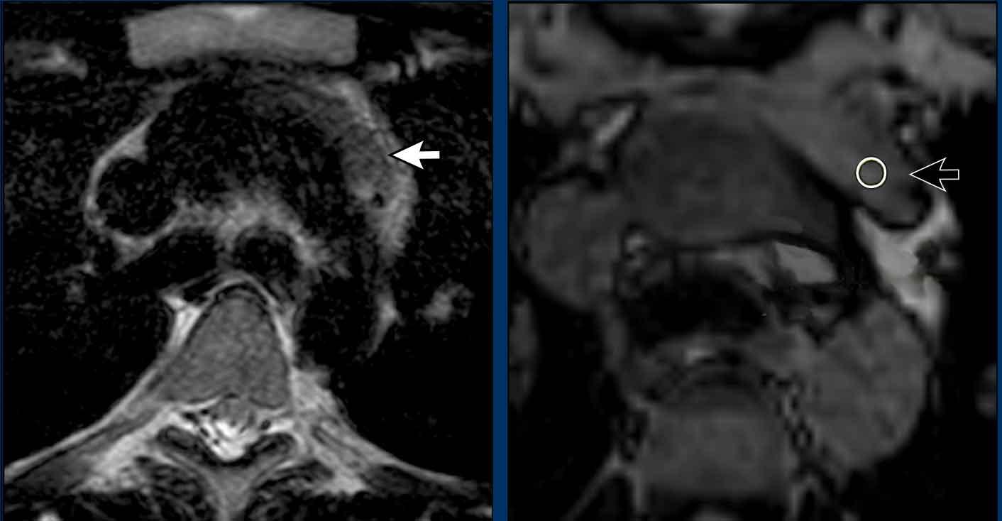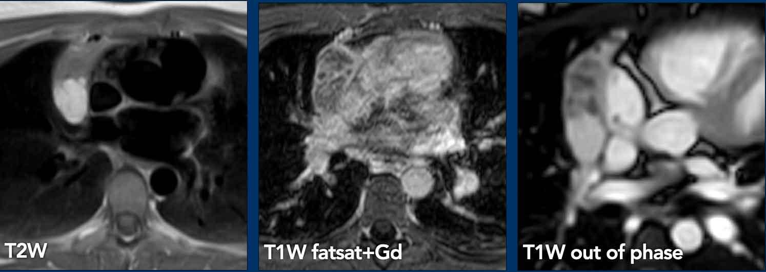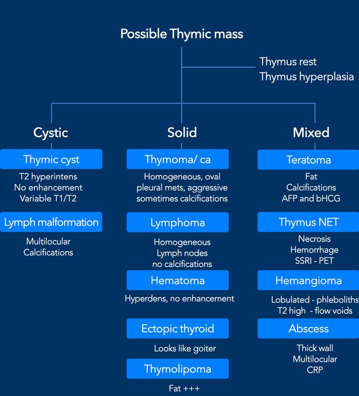 Mặc dù hầu hết các khối tuyến ức được phát hiện tình cờ trên CT ngực, MRI là công cụ hình ảnh tốt nhất để phân biệt thêm một khối nghi ngờ.