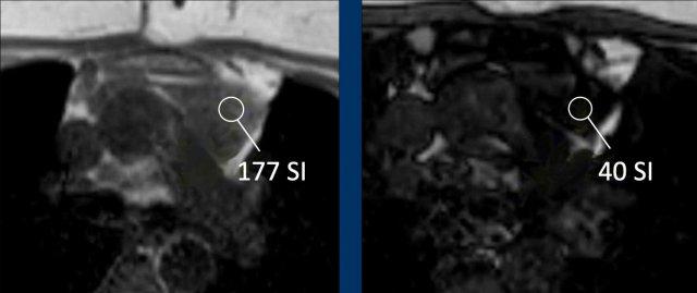 Hình ảnh chuỗi xung gradient-echo nhanh pha đối (out-of-phase) cho thấy sự mất tín hiệu như dự kiến.