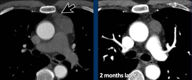 Kết luận được đưa ra là đây là tăng sản tuyến ức hoặc mô tuyến ức tồn dư kích thước lớn, đã thoái triển trong vòng sáu tháng.