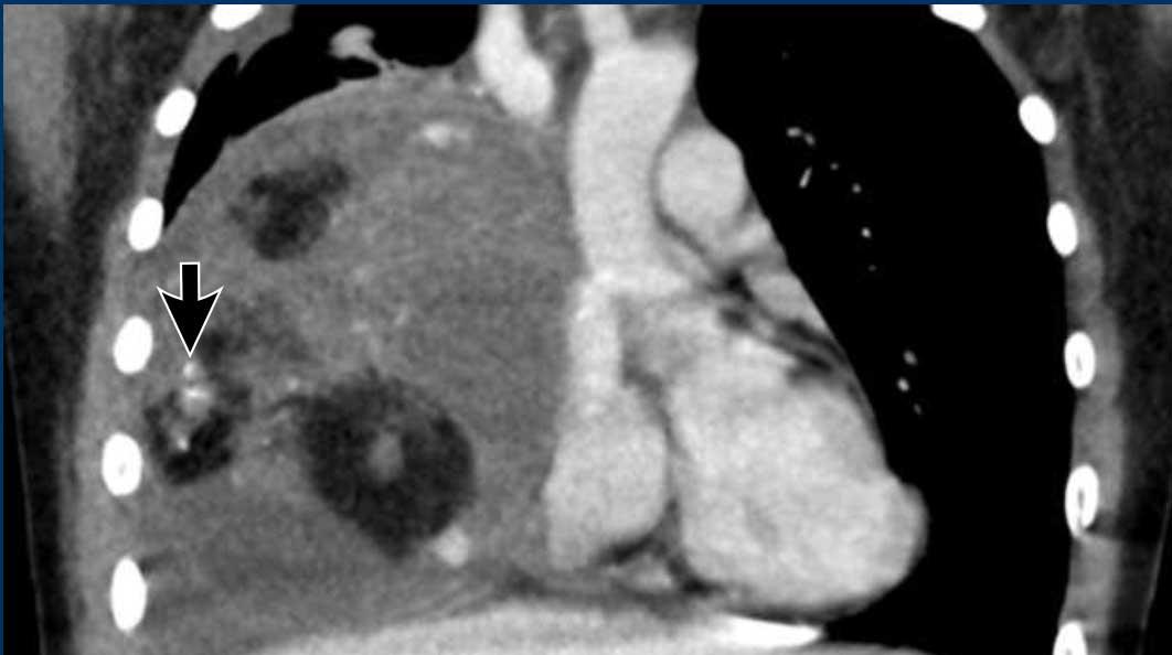 Có một khối trung thất lớn chứa các thành phần dạng nang và đặc, đồng thời có mô mỡ và vôi hóa (mũi tên).
