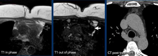 Chuỗi xung T1W đồng pha và đối pha giúp phát hiện mỡ nội bào và phân biệt tuyến ức bình thường, tăng sản tuyến ức với u tân sinh tuyến ức và u lympho.
