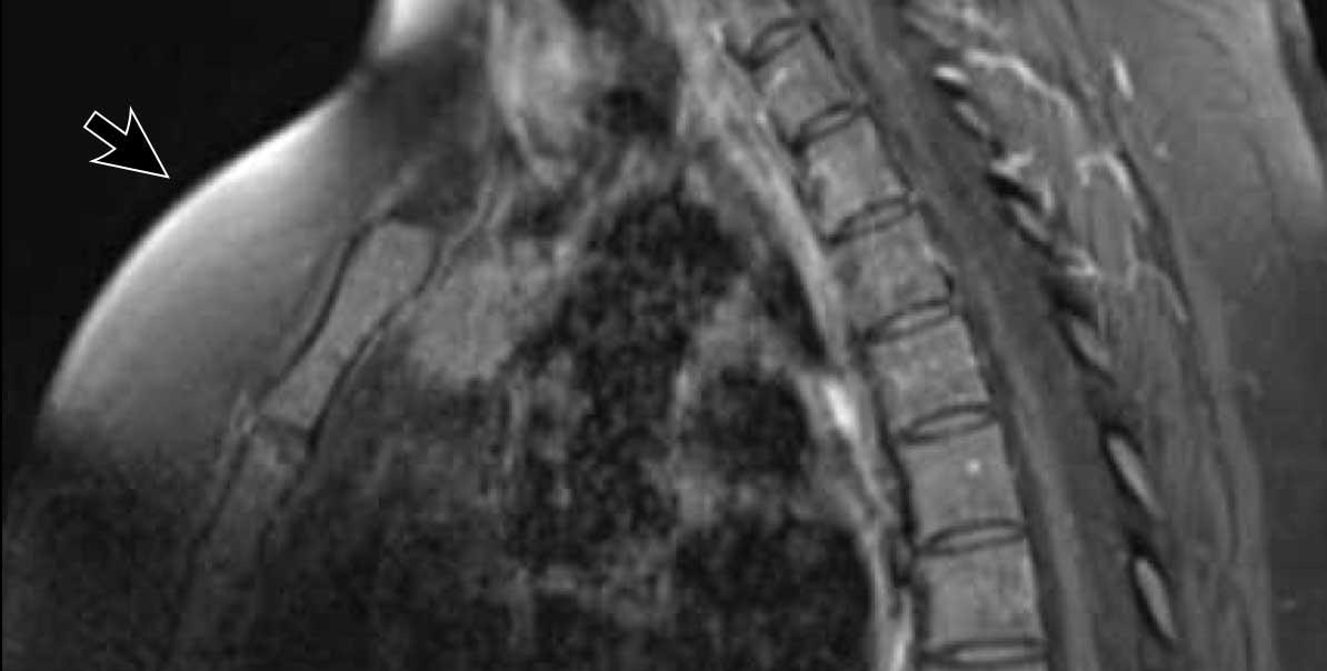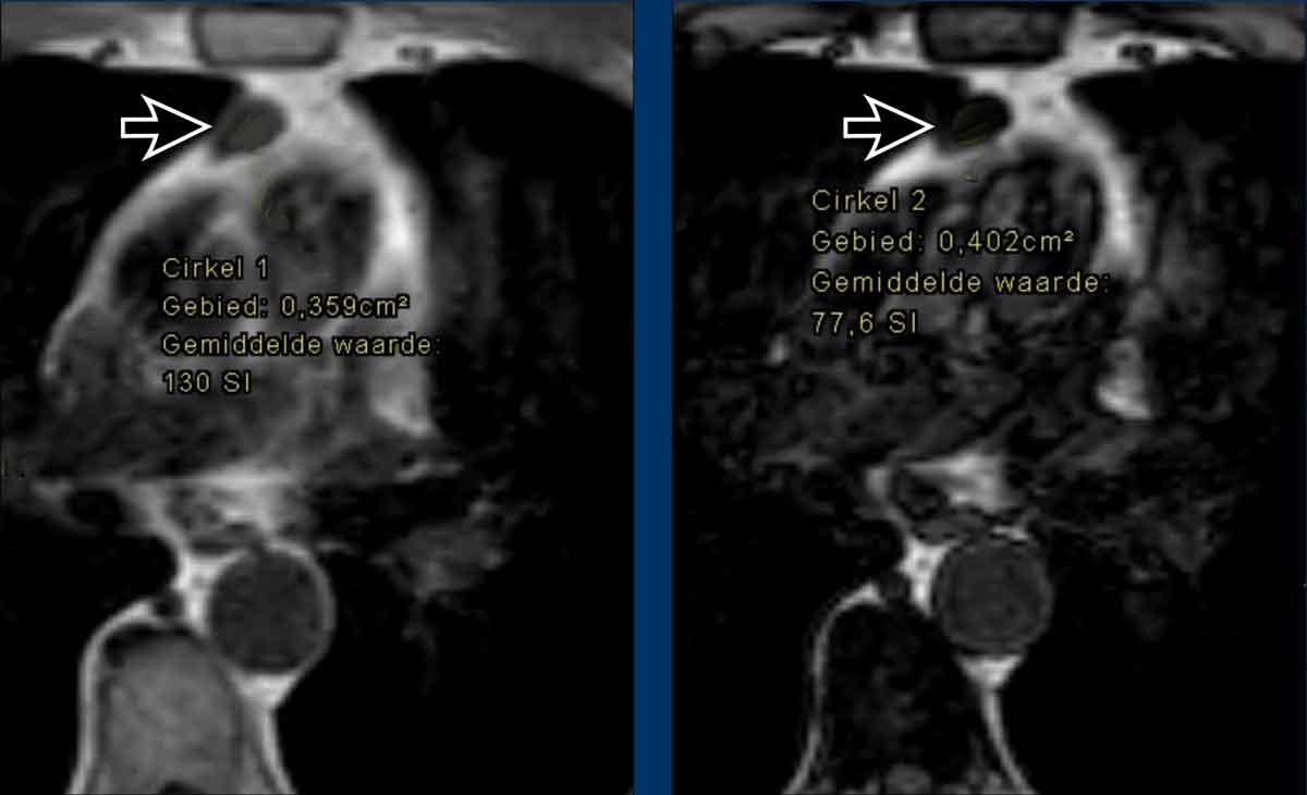 Trên MRI toàn thân (TWK-MRI), tình cờ phát hiện một khối ở tuyến ức.