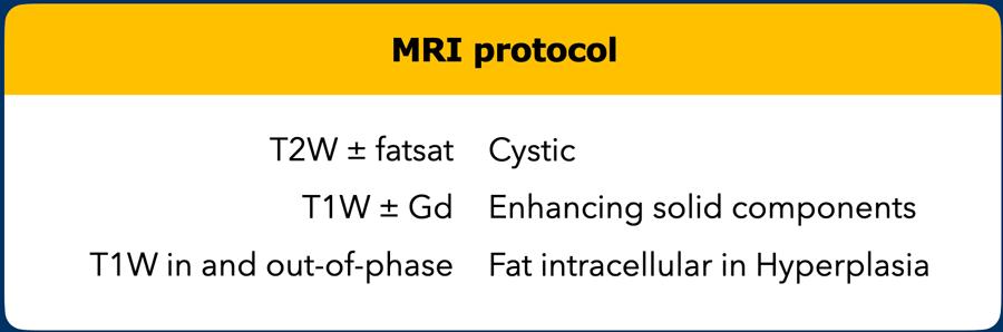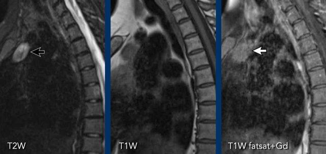 MRI thể hiện rõ hơn đây là tổn thương hỗn hợp với các thành phần dạng nang (chuỗi xung T2W) và các thành phần đặc có ngấm thuốc.