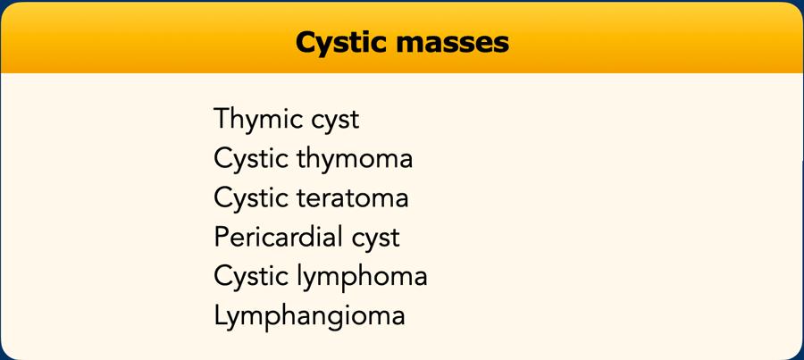 U quái trung thất (mediastinal teratoma) thường biểu hiện là một khối không đồng nhất chứa mỡ và vôi hóa. Khoảng 15% trường hợp biểu hiện là tổn thương nang thuần túy.