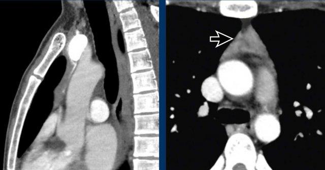 Có bướu giáp và một khối ngấm thuốc trong khoang trước mạch máu của trung thất.