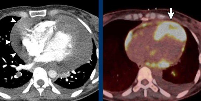 Hình ảnh dày dạng nốt ở mỏm tim (mũi tên) và tràn dịch màng ngoài tim lượng nhiều.