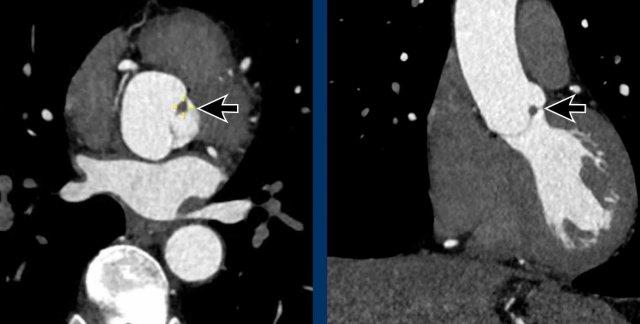 Một phát hiện hiếm gặp là u xơ đàn hồi nhú (mũi tên), đây là khối u nguyên phát thường gặp nhất liên quan đến các van tim, chủ yếu ở van động mạch chủ hoặc van hai lá.