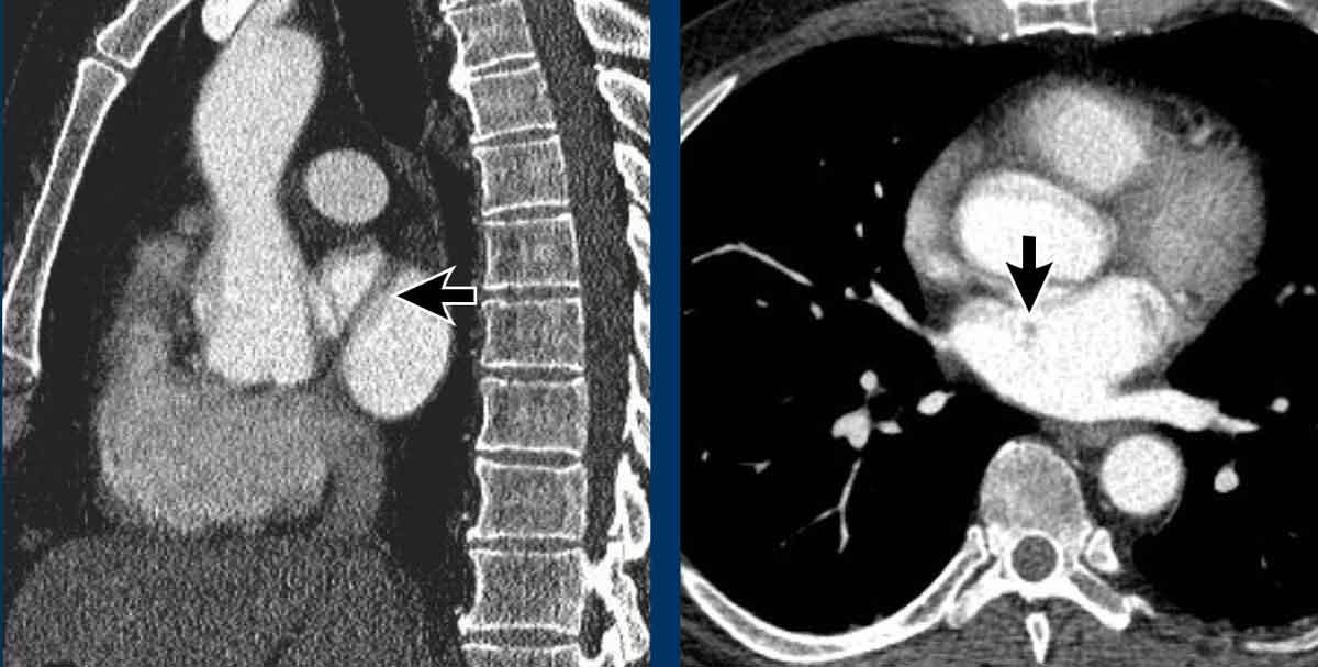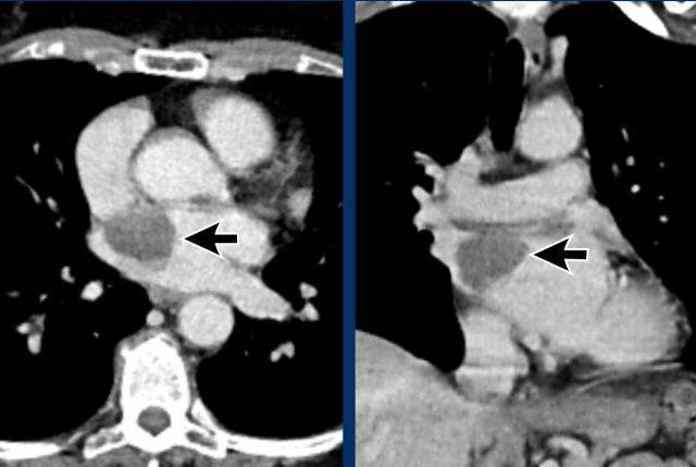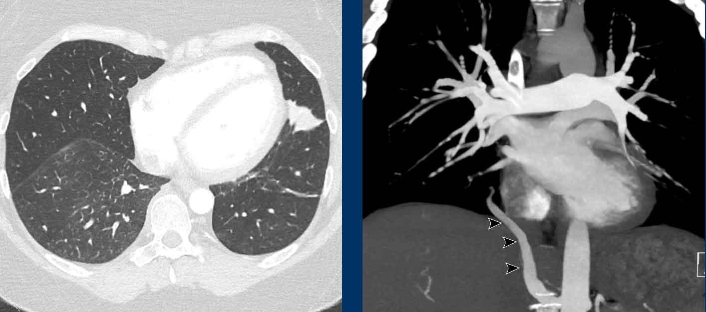 PAPVR bên trái phát hiện tình cờ với dẫn lưu trên tim của máu từ thùy trên trái vào tĩnh mạch tay đầu trái (các mũi tên).