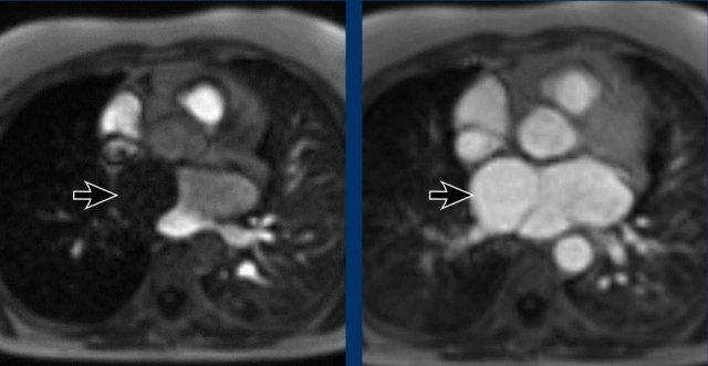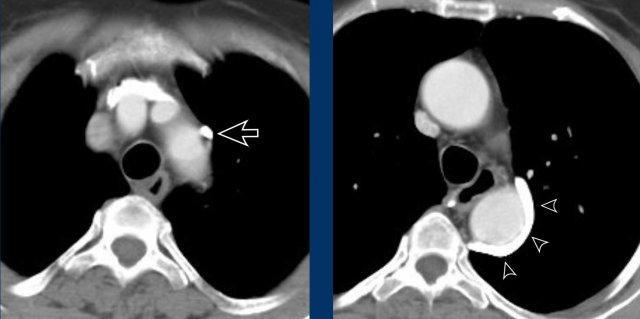 Khi bị giãn và ngấm thuốc cản quang đủ mức, chúng có thể được nhìn thấy trên CT ngực.